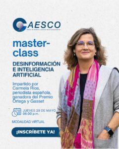 El Centro de Análisis y Estudio de la Comunicación (CAESCO) anunció la masterclass virtual “Desinformación e Inteligencia Artificial”, a realizarse el jueves 29 de mayo a las 6:00 de la tarde con la reconocida periodista española Carmela Ríos, galardonada con el Premio Ortega y Gasset de Periodismo Digital.
